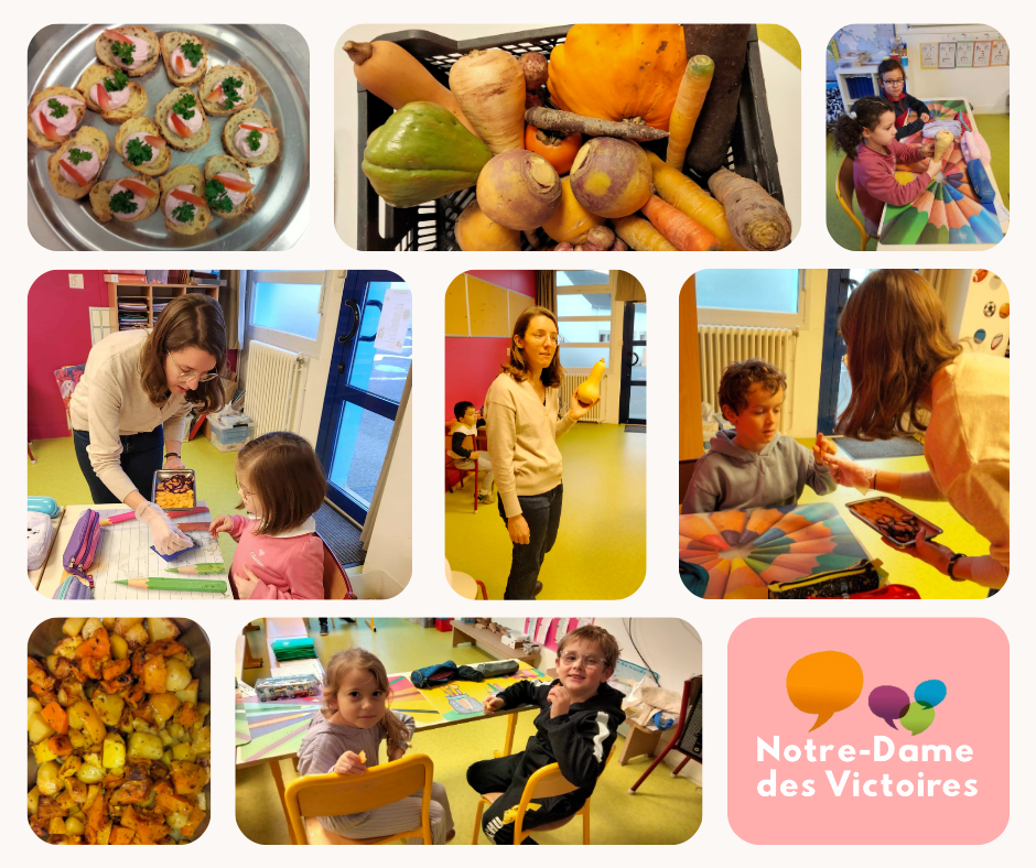 La semaine dernière, tous les élèves de primaire ont reçu la visite de Sarah, stagiaire à la cantine et étudiante en diététique. Les enfants ont découvert ou redécouvert les légumes anciens (panais, pâtisson, carottes de couleur, butternut, navets…).